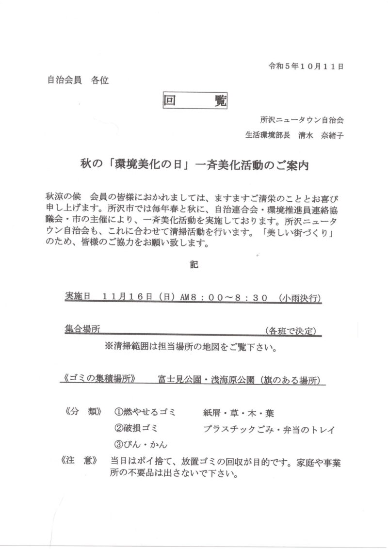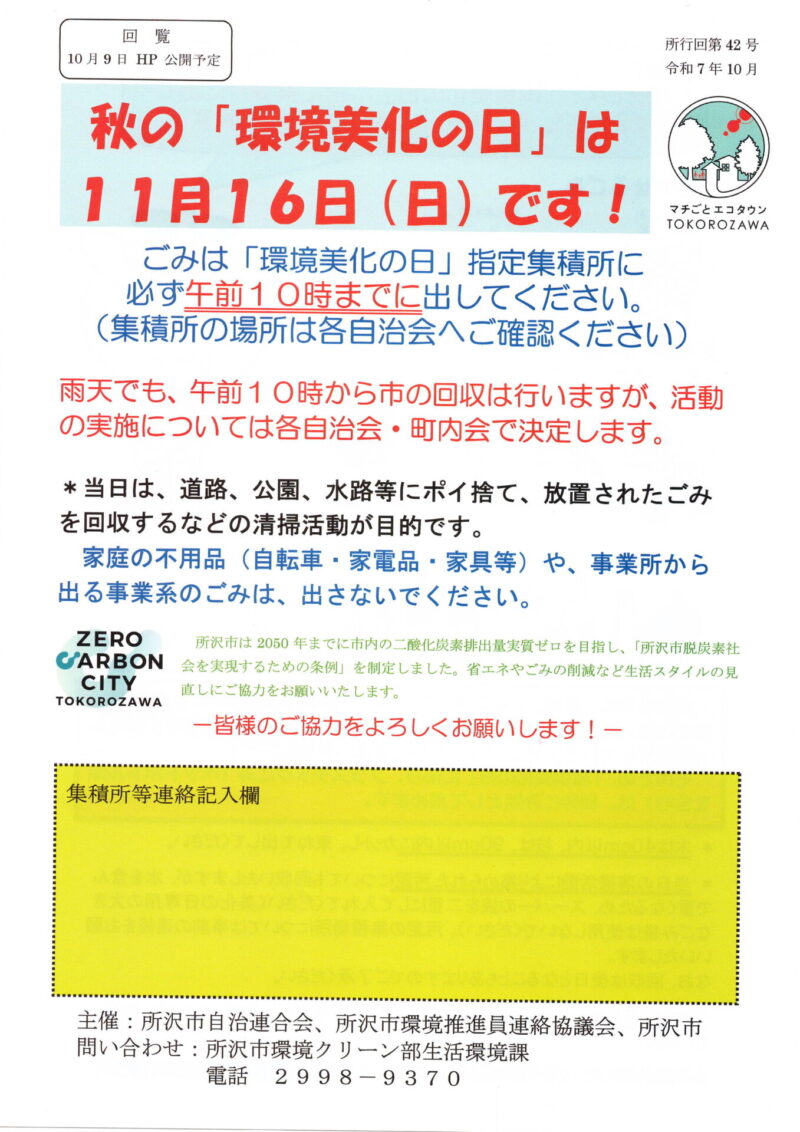秋の「環境美化の日」一斉美化活動のご案内 お知らせ 2025.09.29 お知らせ生活環境部 以下の日程で秋の「環境美化の日——一斉美化活動」を行います。 11月16日(日)AM8:00~8:30(小雨決行) ぜひご参加ください。 集合場所は各班で決定します。 みなさまのご協力をお願い致します。