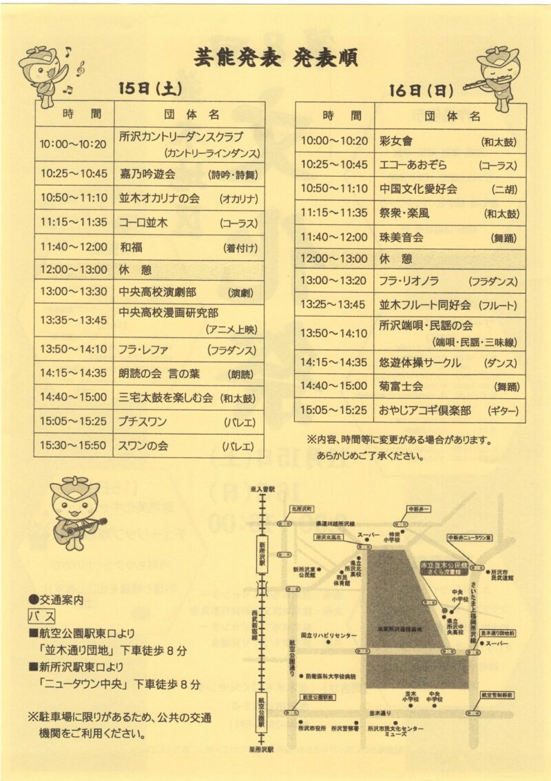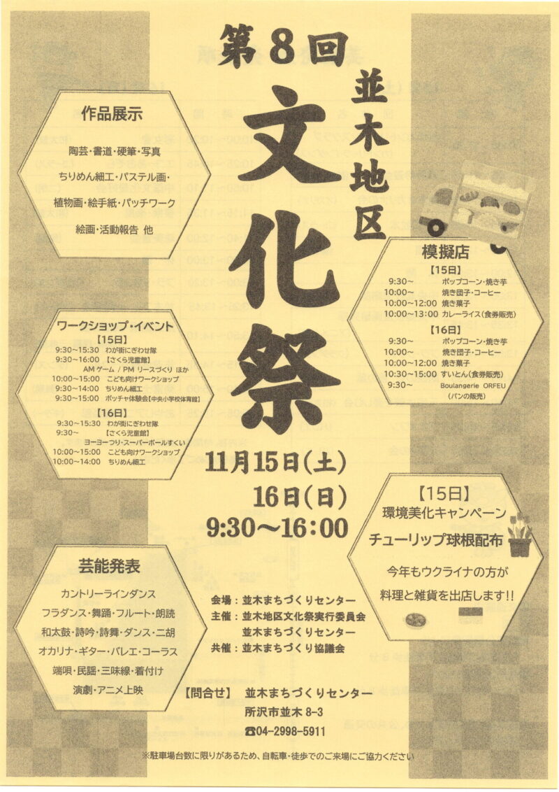 第8回並木地区文化祭のお知らせ お知らせ 2025.09.29 お知らせ 以下の要領で第8回並木地区文化祭が開催されます。 興味のある方はふるってご参加ください。 日時:11月15日(土)16日(日)19:30〜16:00 会場:並木まちづくりセンター