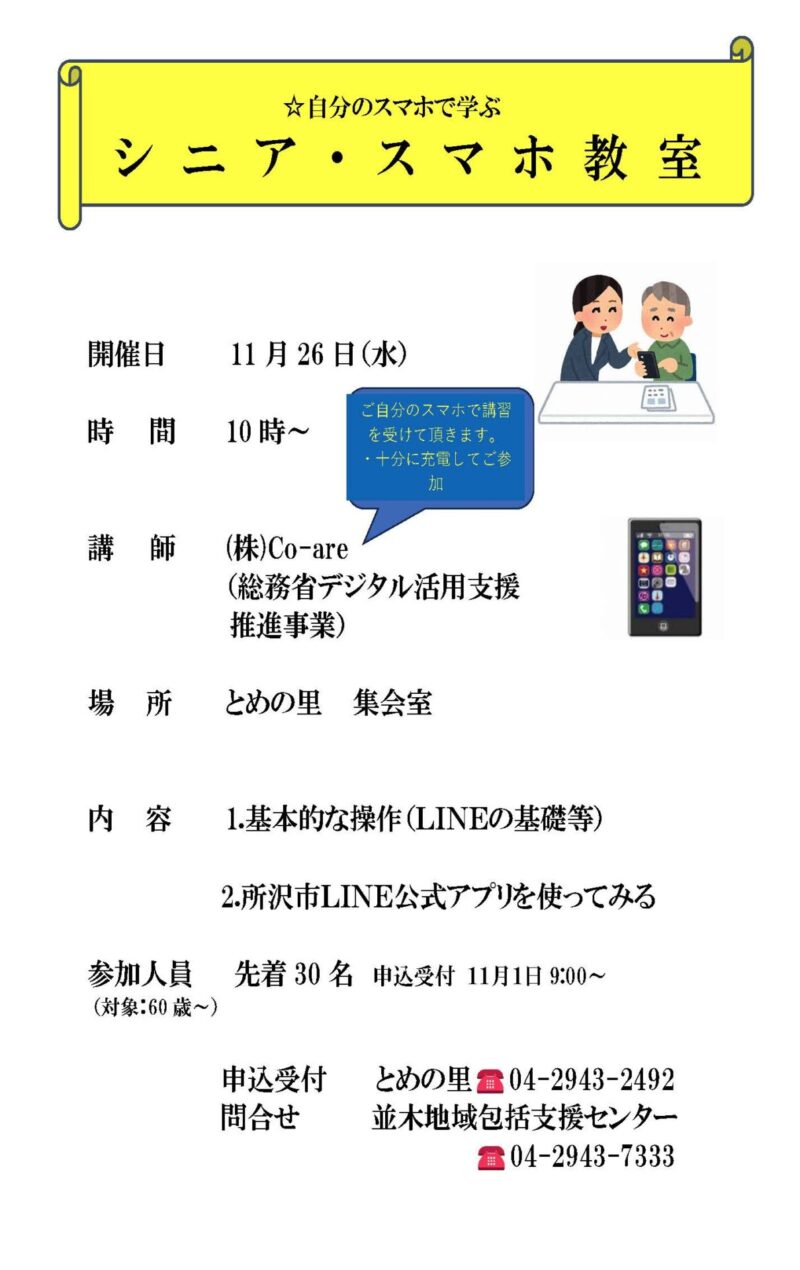 ☆自分のスマホで学ぶシニア・スマホ教室 委員会ニュース 2025.10.26 委員会ニュース 並木地域包括支援センターからのご案内です。 内容は、①基本的な操作(LINEの基礎等) ②所沢市LINE公式アプリを使ってみる 「個別相談」の時間に【マイ自治会】登録・操作方法など教えていただけるそうです。