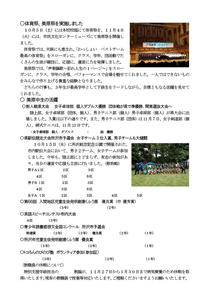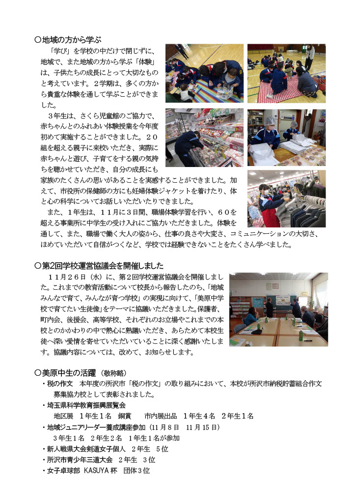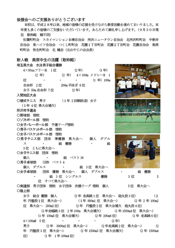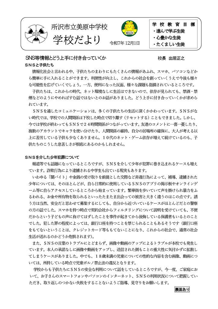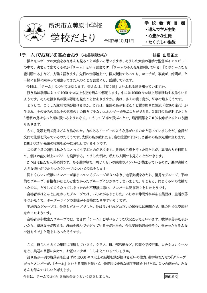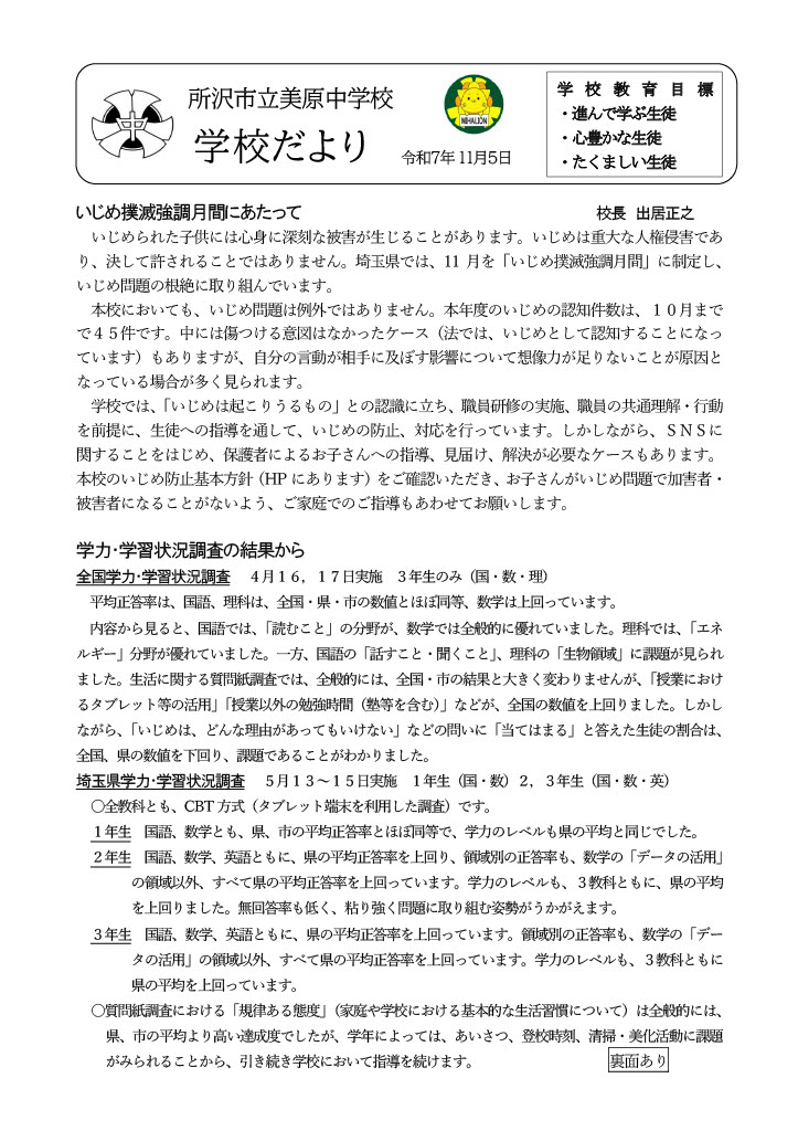 美原中学校は、中新井地区等を担当学区とする中学校です。このたび美原中学校のご協力を得て「学校だより」を掲載することにしました。お子様をお持ちの方は既にご存知のことかもしれませんが、そうでないご家庭の方は、なかなか美原中学校の状況を知ることは難しい状況です。美原中学校は、学力向上をはじめ合唱、美術、スポーツ等で頑張っております。ぜひ、ご覧になってください。なお、生徒さんの名前は、個人情報なので記載されていません。(10月以降を掲載しています。体育祭、美原祭は、すでにホームページとスマホアプリに掲載してあります)