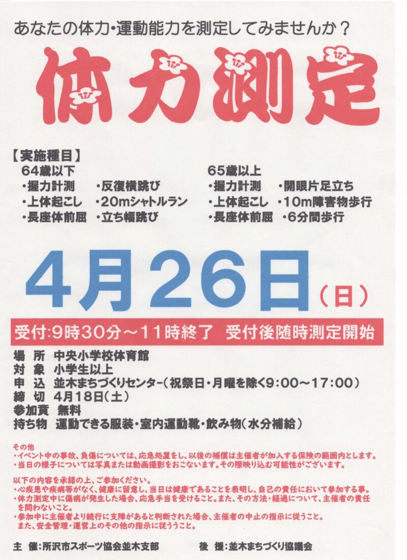 所沢市スポーツ協会並木支部・並木まちづくり協議会より体力測定のご案内です。